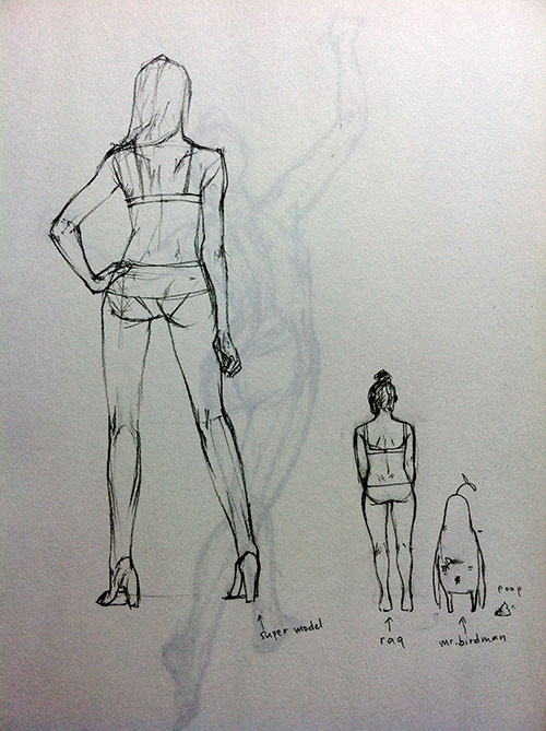 Figure drawings and doodles on sketchbook with pencil: